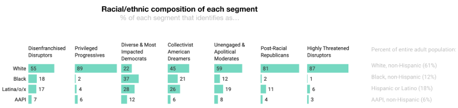 The first project, Racial Ideology Mapping, was conducted in partnership with PerryUndem and the ACLU. We set out to identify and measure the underlying belief systems that shape how people understand race and identity, and how these beliefs relate to policy, political attitudes, and behavior – what we call Racial Ideology. These fundamental questions include: What shapes the way people think about race? What are their experiences with people who share their racial or ethnic background, and those who don’t? How do these experiences affect their political beliefs and attitudes? And do people’s racial ideologies map onto their races and ethnicities?